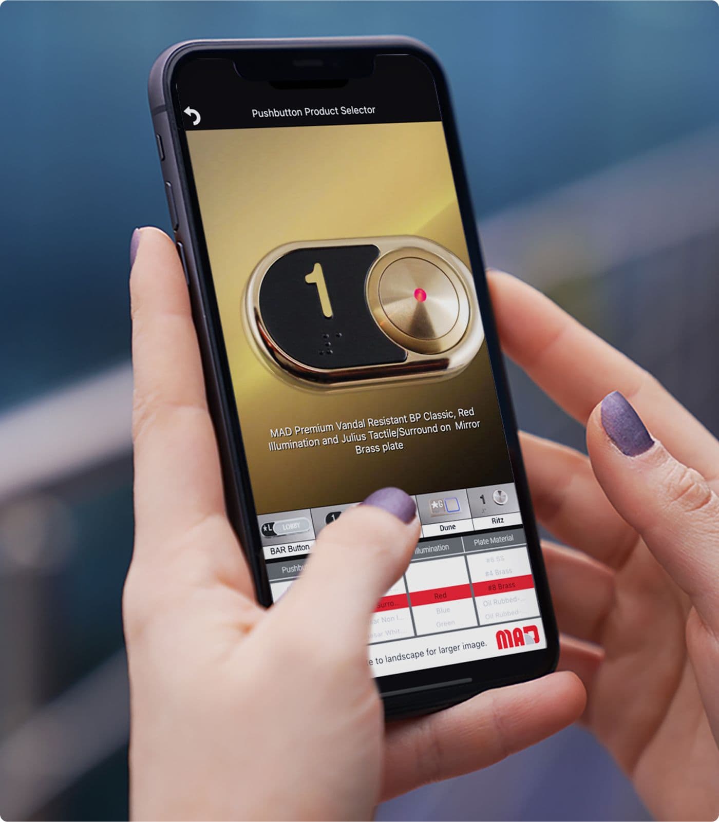 Design your ideal cab interior or pushbutton combination with the mobile version of our Design Center. Work interactively with your board members or clients to make design selections regarding shape, finish, and style without physical samples.
